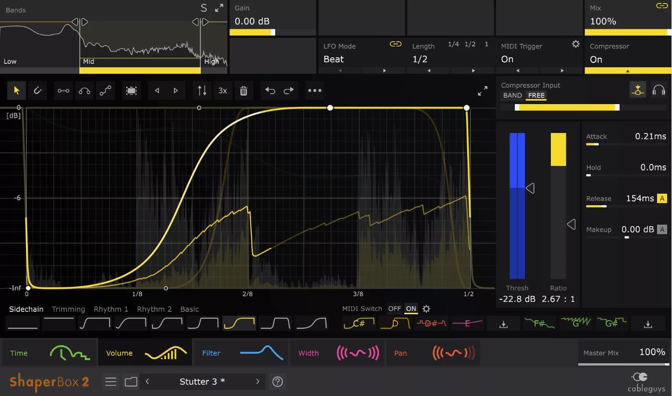 Many people know it as an alternative to sidechain compression, but if used correctly, it can provide many additional opportunities. Thanks to it, you can draw any shape to control volume, filters, and pitch. And the trigger control function using MIDI and Audio triggers allows you to set any rhythm.