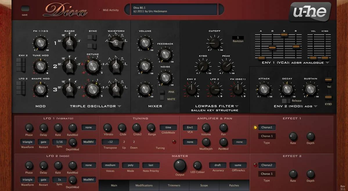 For many years now, it has been the most popular synthesizer for fans of “analog” sound. Soft sound, high-quality filters and an abundance of presets allow Diva to remain in all lists of the best synthesizers for more than ten years.